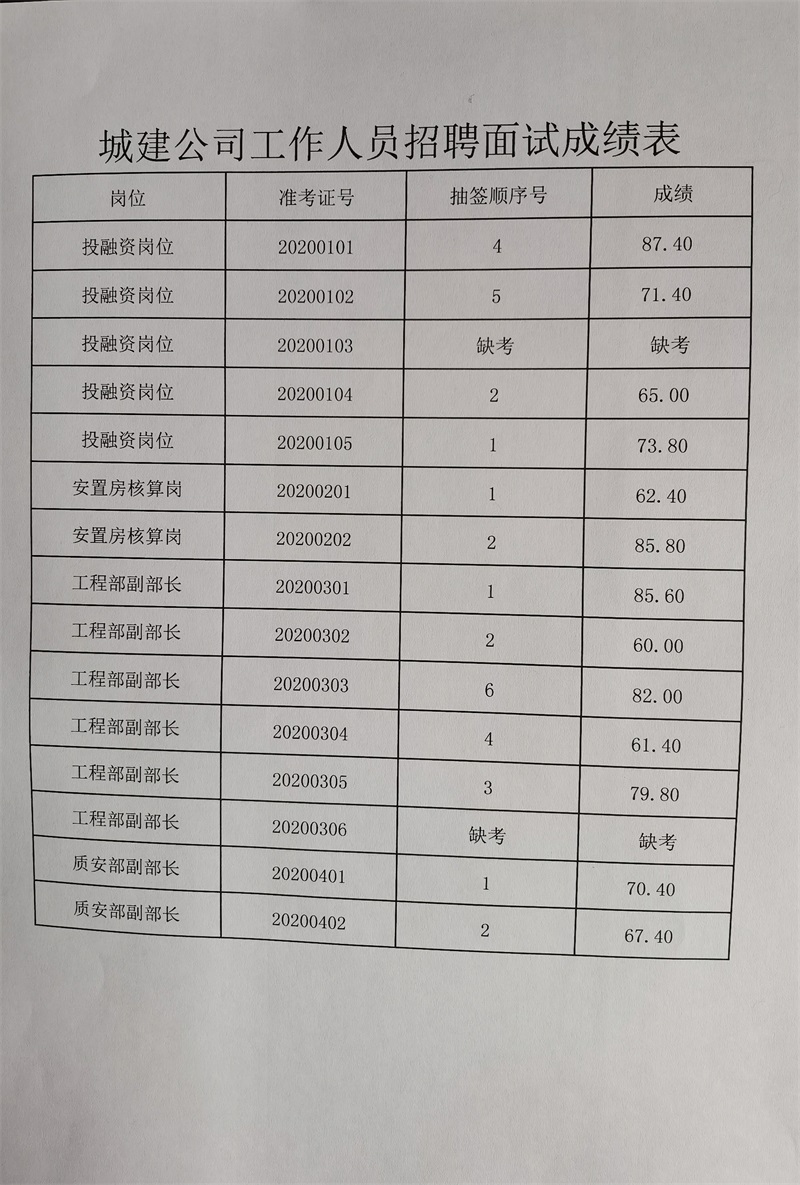 宜昌市點軍城鄉(xiāng)建設(shè)開發(fā)有限公司2020年公開招聘工作人員面試于2020年12月12日結(jié)束,現(xiàn)將面試成績公示如下,如有疑問請于工作日撥打公司電話咨詢。電話為0717-6622026,公示期5天。
