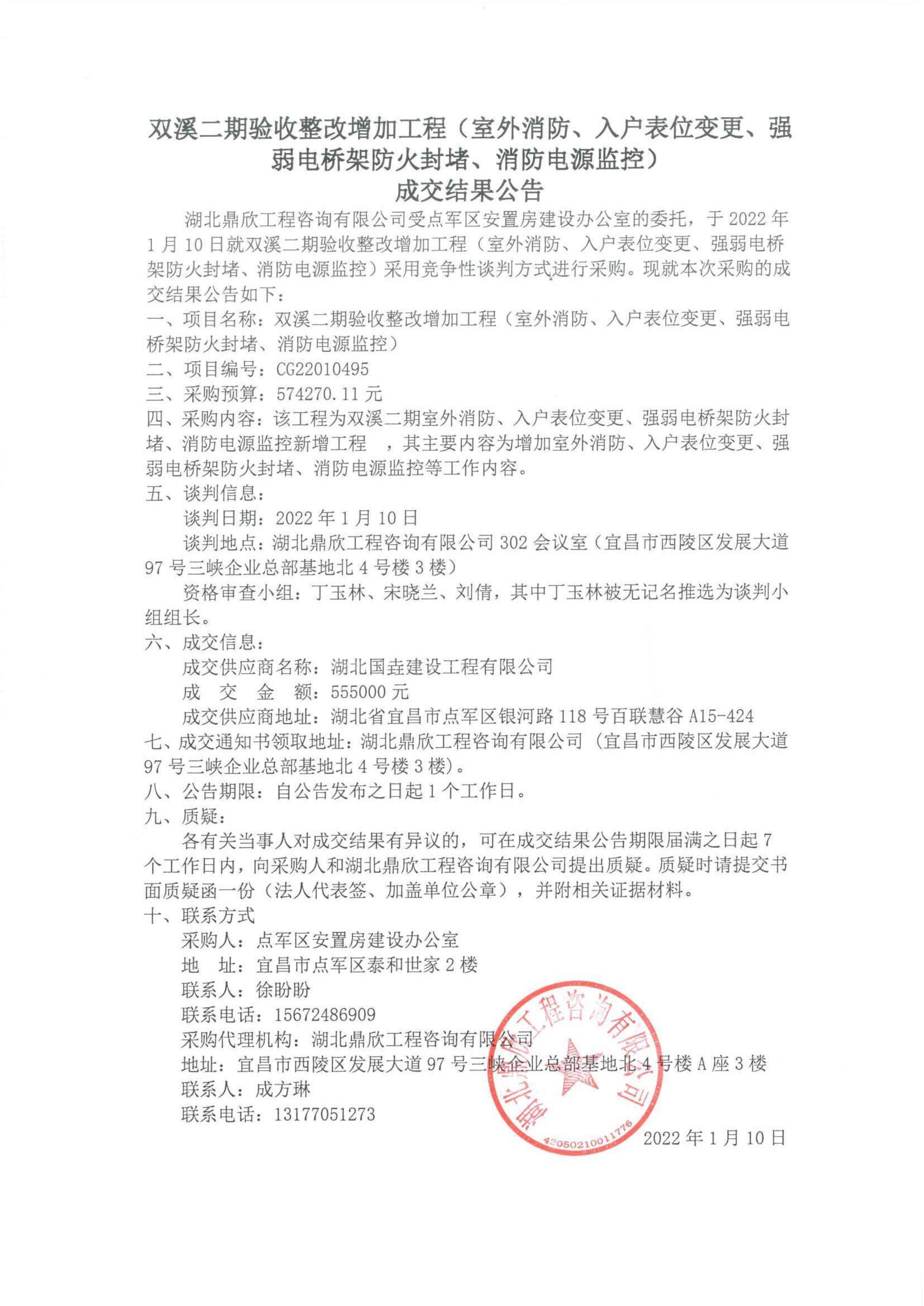 雙溪二期驗收整改增加工程(室外消防、入戶表位變更、強弱電橋架防火封堵、消防電源監(jiān)控)?成交結(jié)果公告