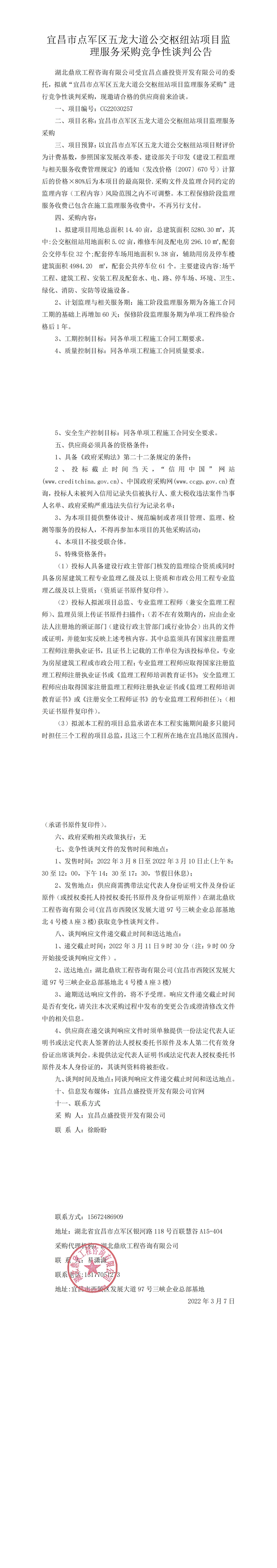宜昌市點(diǎn)軍區(qū)五龍大道公交樞紐站項(xiàng)目監(jiān)理服務(wù)采購(gòu)競(jìng)爭(zhēng)性談判公告