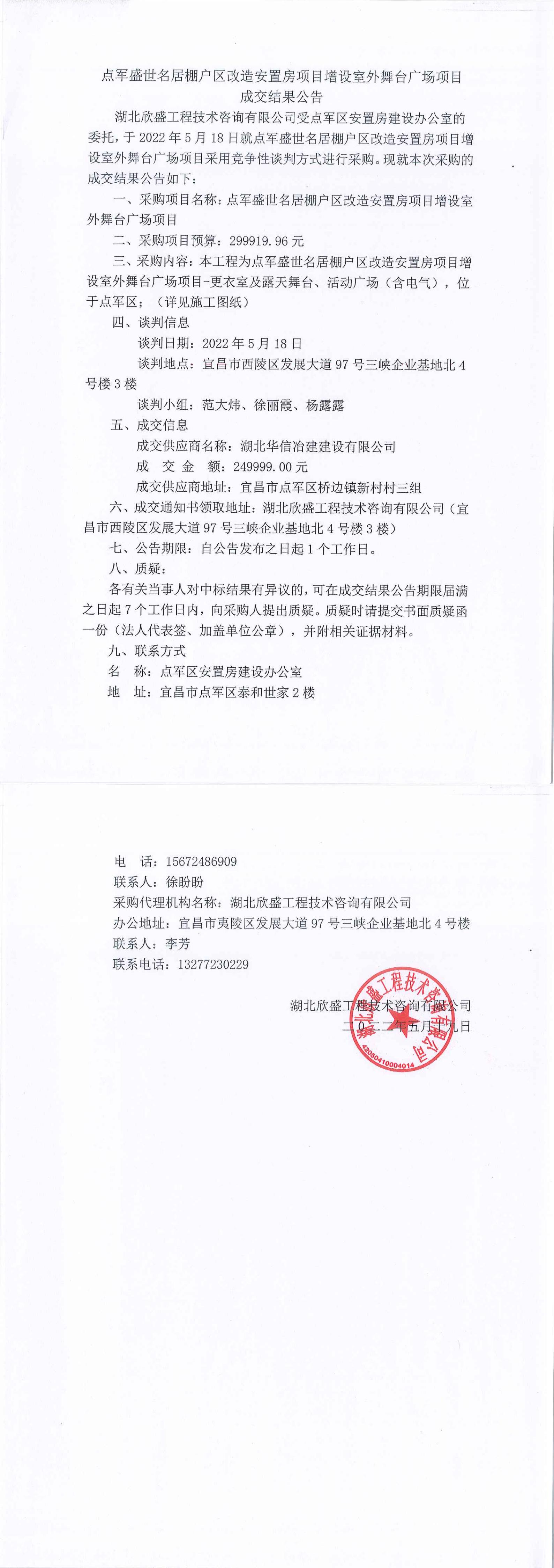 點軍盛世名居棚戶區(qū)改造安置房項目增設(shè)室外舞臺廣場項目成交公告