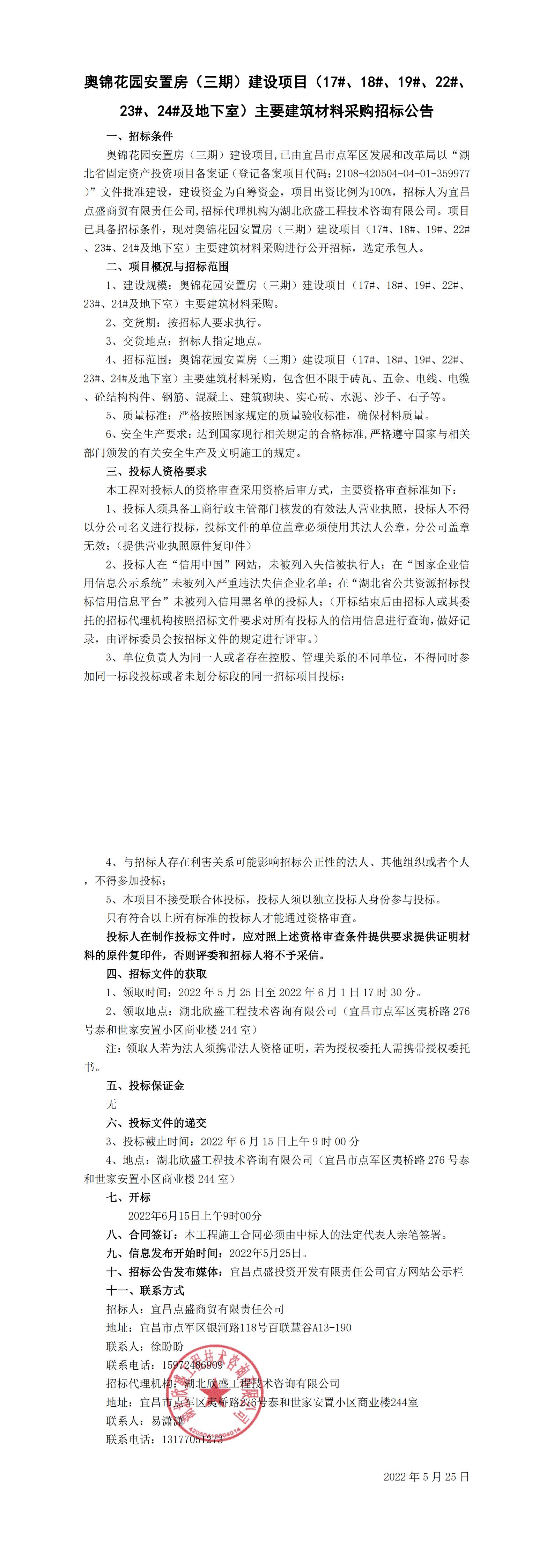 宜昌點盛商貿(mào)有限責(zé)任公司關(guān)于對奧錦花園安置房(三期)建設(shè)項目(17#、18#、19#、22#、23#、24#及地下室)主要建筑材料的采購公告