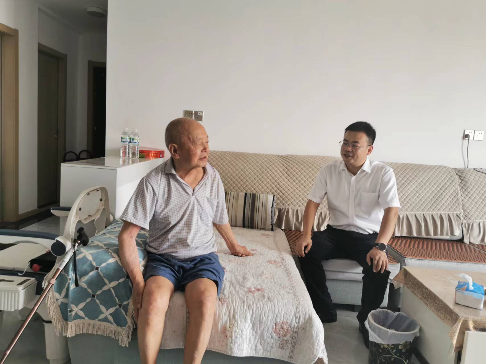 在老黨員劉世松家中,楊濤親切詢問了劉老的身體狀況和生活情況,得知劉老曾在橋邊村委會工作,現(xiàn)已85歲高齡,2018年患中風后,腿腳不便,致使出行困難,但仍積極參加橋邊村黨支部活動,為村集體經(jīng)濟建設(shè)和基層治理建言獻策。