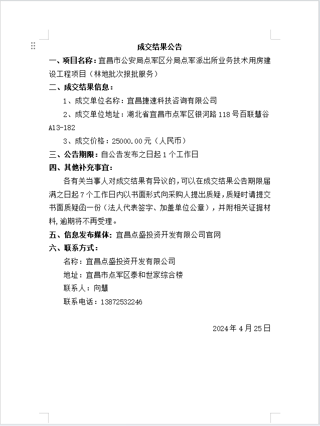 宜昌市公安局點(diǎn)軍區(qū)分局點(diǎn)軍派出所業(yè)務(wù)技術(shù)用房建設(shè)工程項(xiàng)目 (林地批次報(bào)批服務(wù))成交公告