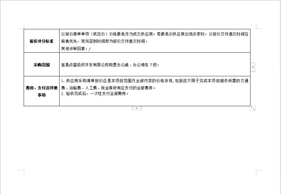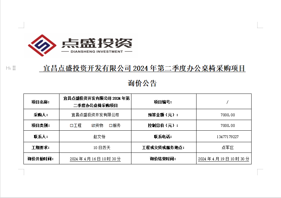 宜昌點(diǎn)盛投資開發(fā)有限公司2024年第二季度辦公桌椅采購(gòu)項(xiàng)目 詢價(jià)公告