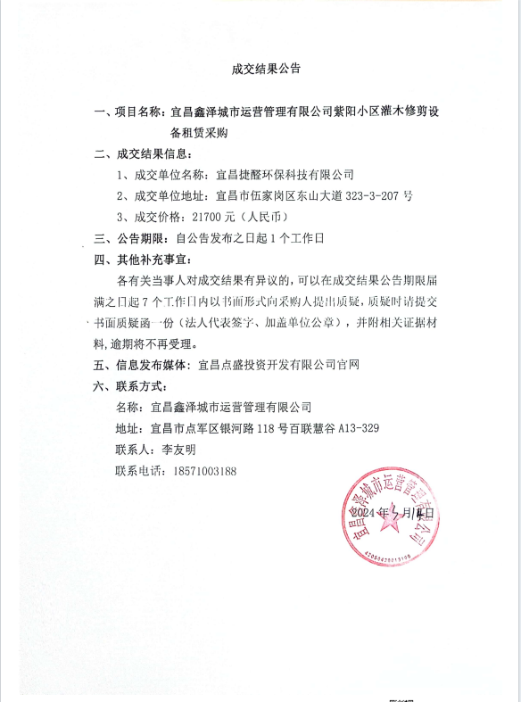 宜昌鑫澤城市運營管理有限公司管紫陽小區(qū)灌木修剪設備租賃采購項目成交公告