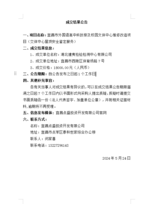 宜昌市外國語高中科技樓及校園文體中心維修改造項目(交體中心屋頂安全鑒定服務)成交公告