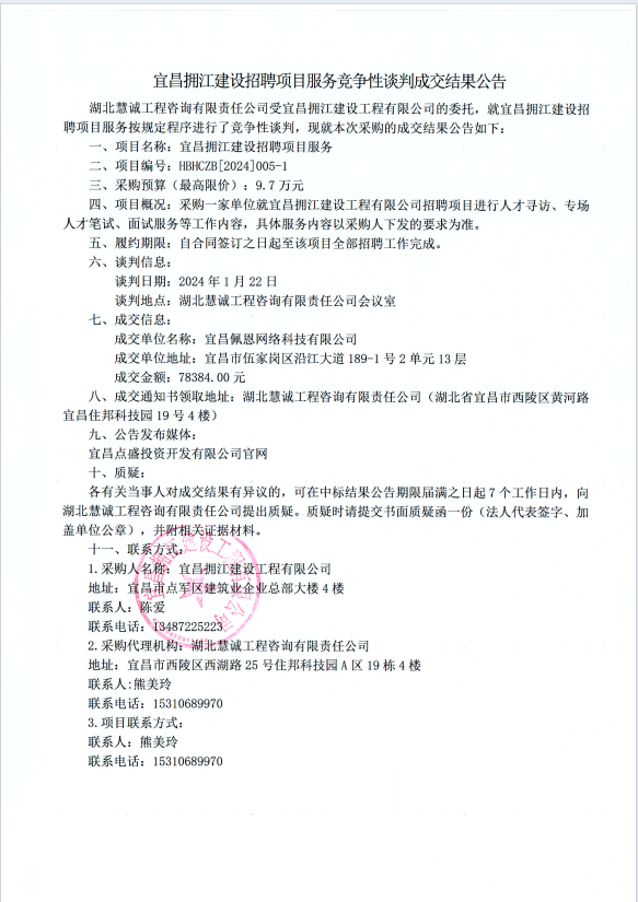 宜昌擁江建設(shè)招聘項目服務(wù)競爭性談判成交結(jié)果公告