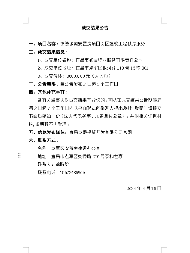 錦繡城南安置房項目A區(qū)建筑工程秩序服務(wù)成交公告