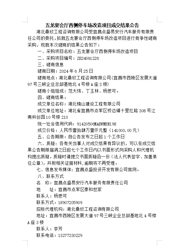 五龍宴會廳西側(cè)停車場改造項目成交結(jié)果公告