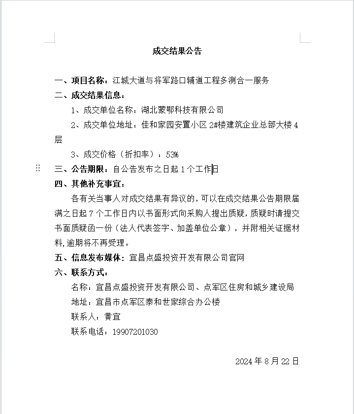 江城大道與將軍路口輔道工程多測(cè)合一服務(wù)成交公告