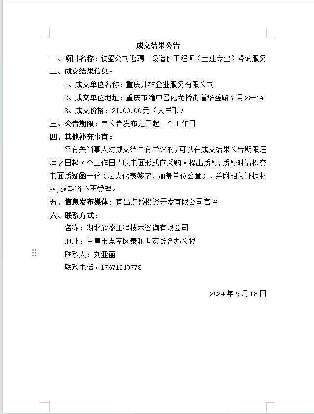 欣盛公司返聘一級造價(jià)工程師(土建專業(yè))咨詢服務(wù) 成交公告