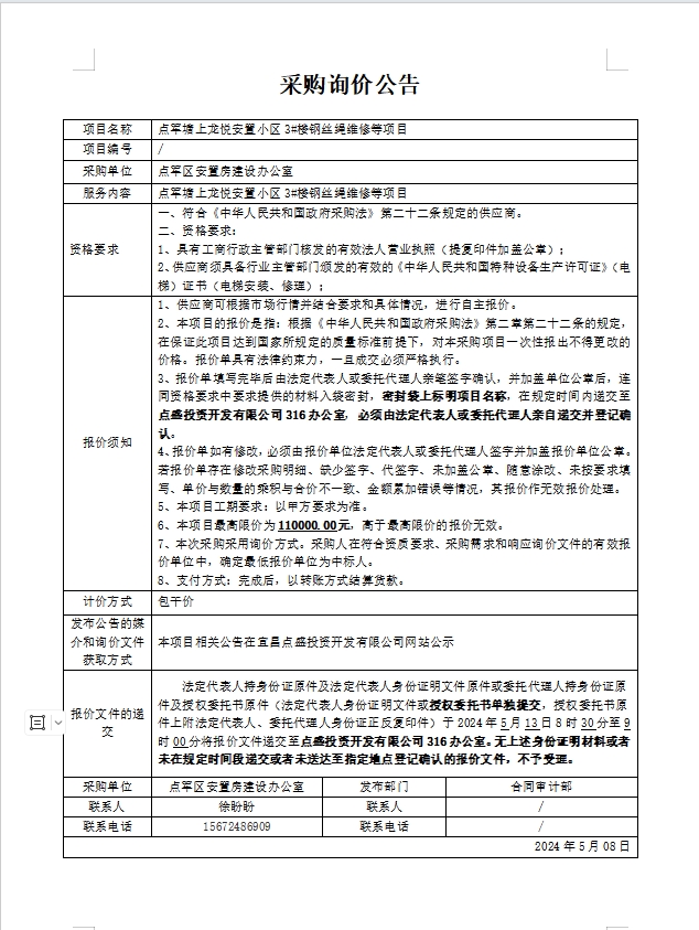 點(diǎn)軍塘上龍悅安置小區(qū)3#樓鋼絲繩維修等項(xiàng)目詢價公告