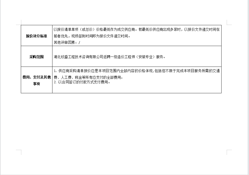 欣盛公司返聘一級造價工程師(安裝專業(yè))咨詢服務(wù)詢價公告