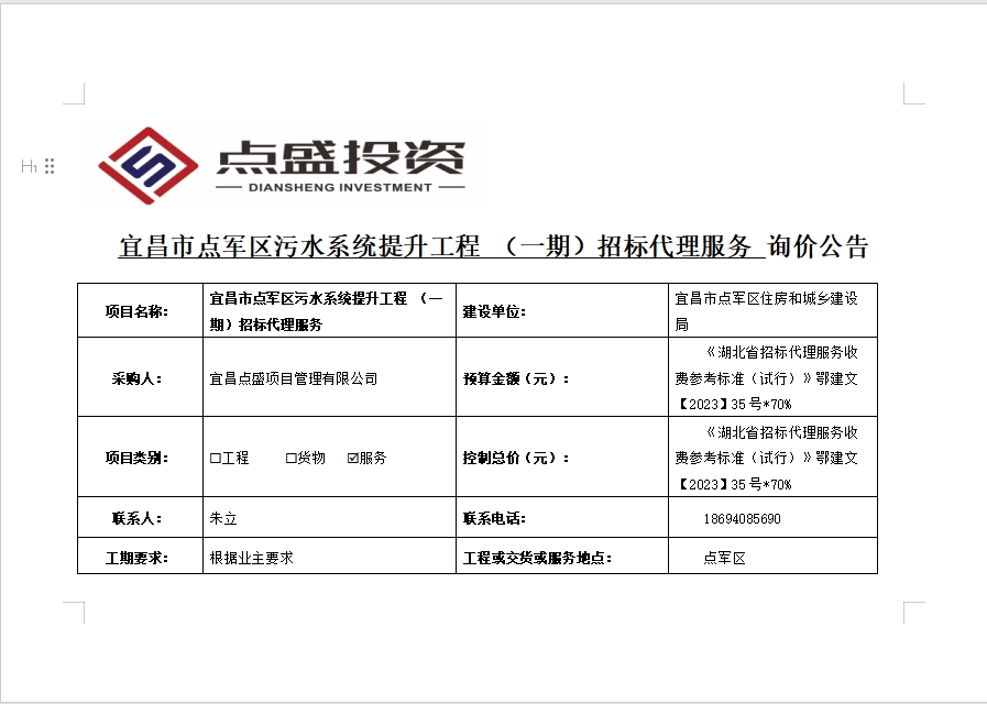 宜昌市點軍區(qū)污水系統(tǒng)提升工程 (一期)招標(biāo)代理服務(wù)詢價公告
