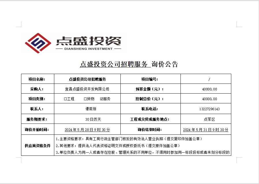 點(diǎn)盛投資公司招聘服務(wù)詢價公告