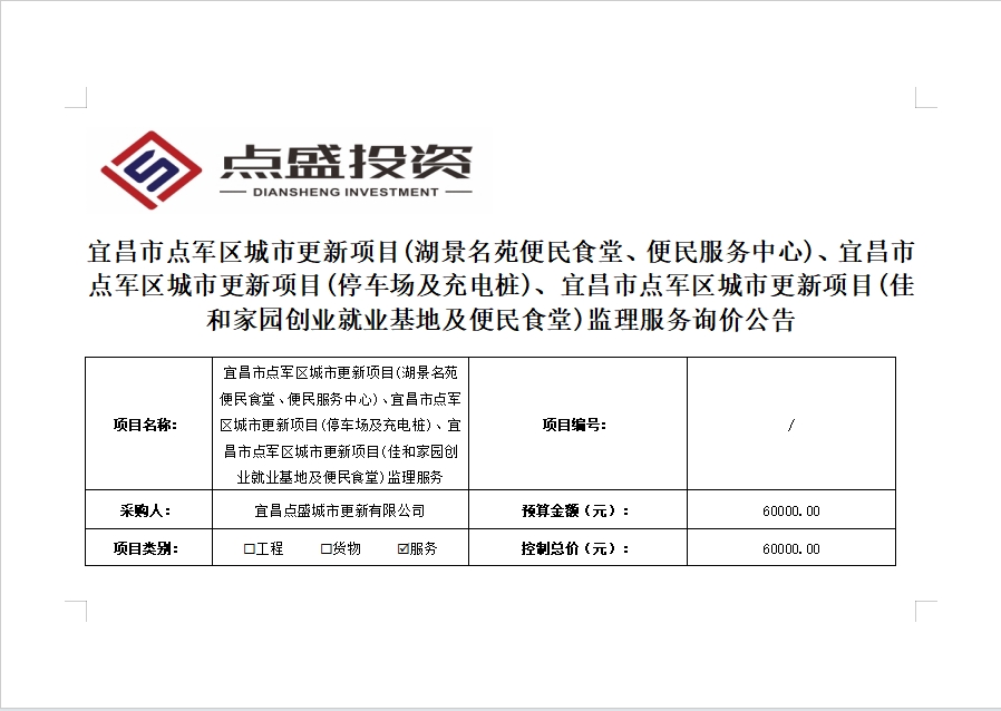 宜昌市點(diǎn)軍區(qū)城市更新項(xiàng)目(湖景名苑便民食堂、便民服務(wù)中心)、宜昌市點(diǎn)軍區(qū)城市更新項(xiàng)目(停車場及充電樁)、宜昌市點(diǎn)軍區(qū)城市更新項(xiàng)目(佳和家園創(chuàng)業(yè)就業(yè)基地及便民食堂)監(jiān)理服務(wù)詢價(jià)公告