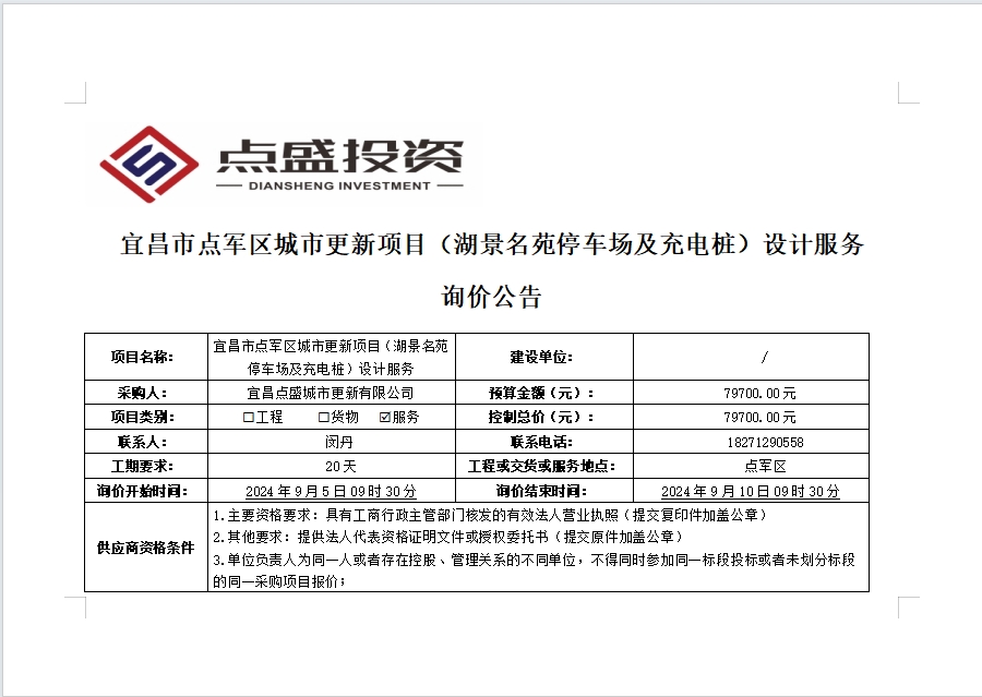 宜昌市點(diǎn)軍區(qū)城市更新項(xiàng)目(湖景名苑停車場(chǎng)及充電樁)設(shè)計(jì)服務(wù)詢價(jià)公告