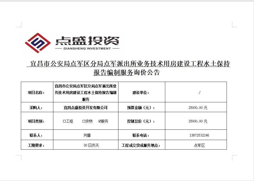 宜昌市公安局點軍區(qū)分局點軍派出所業(yè)務技術(shù)用房建設(shè)工程水土保持報告編制服務詢價公告