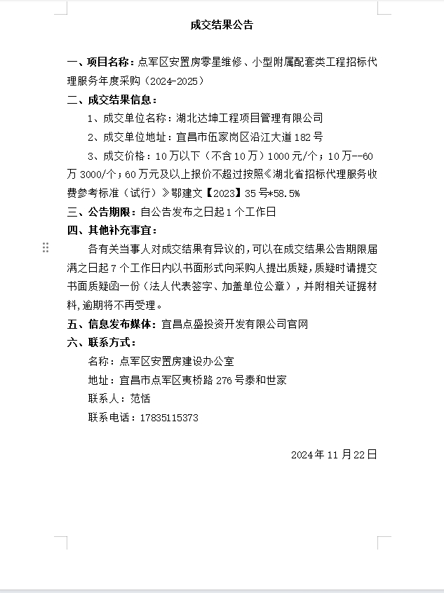 點軍區(qū)安置房零星維修、小型附屬配套類工程招標代理服務(wù)年度采購(2024-2025)成交公告