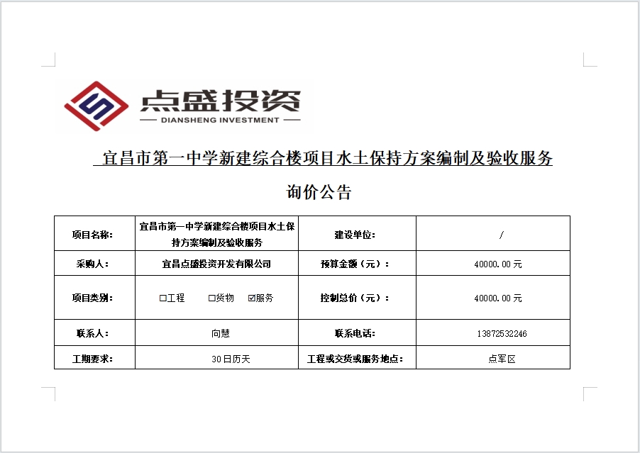 宜昌市第一中學(xué)新建綜合樓項(xiàng)目水土保持方案編制及驗(yàn)收服務(wù)詢(xún)價(jià)公告
