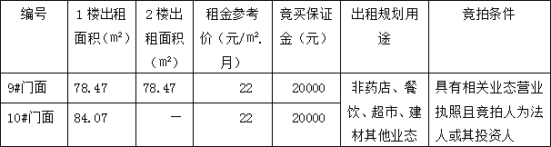 上述第9號(hào)門面房整體出租1至2樓,10#門面房只出租一樓。目前,上述門面房均處于空置的毛坯狀態(tài),現(xiàn)狀分別對(duì)外出租。相關(guān)競(jìng)買事項(xiàng)詳見(jiàn)本公司拍賣資料中的《競(jìng)買協(xié)議》樣本特別說(shuō)明條款內(nèi)容,且標(biāo)的物自公告之日起至2021年12月10日17:00止,在標(biāo)的物現(xiàn)場(chǎng)展示(集中看房時(shí)間定于2021年12月10日8:30-12:00,14:00-17:00)。